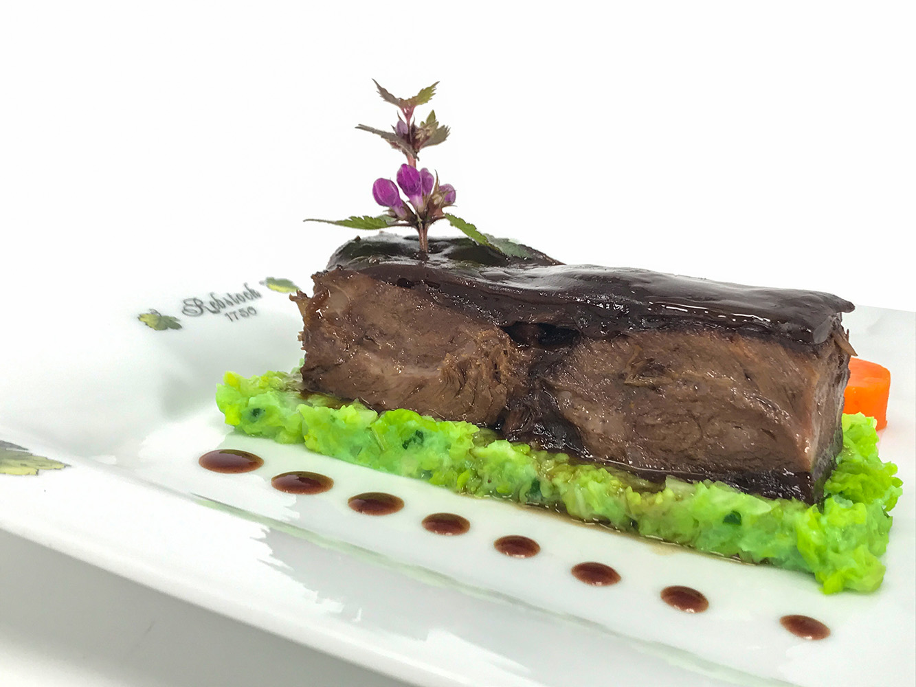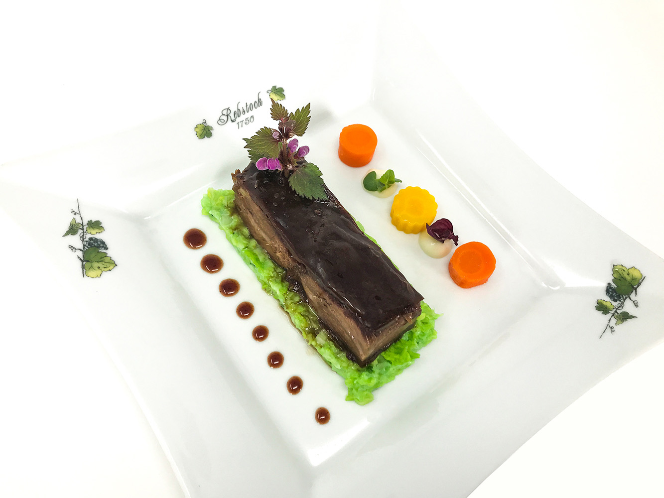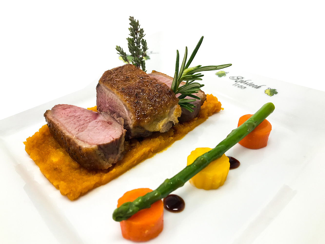 Gebratene Bauernentenbrust mit Honig-Tannennadel-Glanz auf Rübchen-Ingwer-Püree