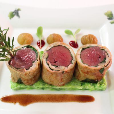 Medaillon vom Hirschkalbsrücken im Pfannkuchenmantel